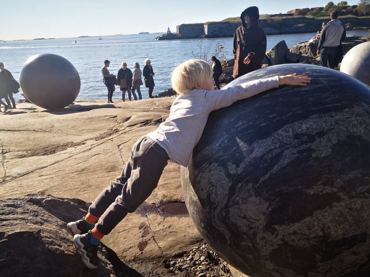 Ehätin syyskuussa Taidehallin suomalaisen valokuvan näyttelyyn ja perheenä karautimme viimeisenä mahdollisena päivänä myös Vallisaaren Helsinki Biennaaliin. Totta kai siinä oli sekoilua laivalle ehtimisen kanssa, mutta kun saareen pääsimme, siellä oli melkein helle! Kuopusta viehättivät erityisesti planeettamaiset pallot merenrannassa. Mielestäni kiinnostava oli myös metsään tehty äänitaideteos. Lisää taidetta toivottavasti loppuvuonna!